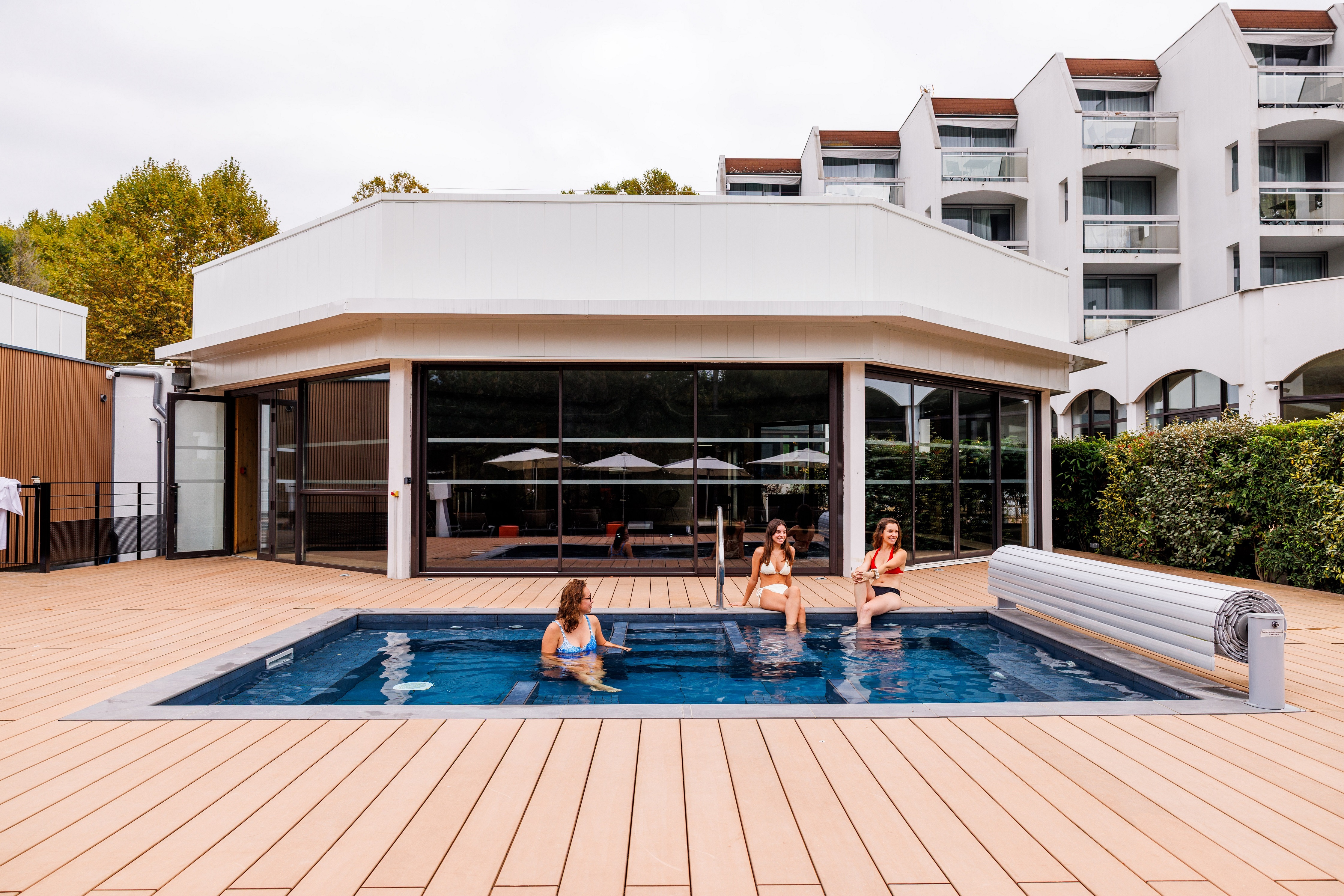Les Bains des Alpes – Spa Nuxe du Domaine de Marlioz : Choisissez entre nos 3 espaces : Espace aqualudique, espace Nuxe ou espace Balnéothérapie pour un pur moment de détente au cœur de la nature avec vue sur le parc et les montagnes